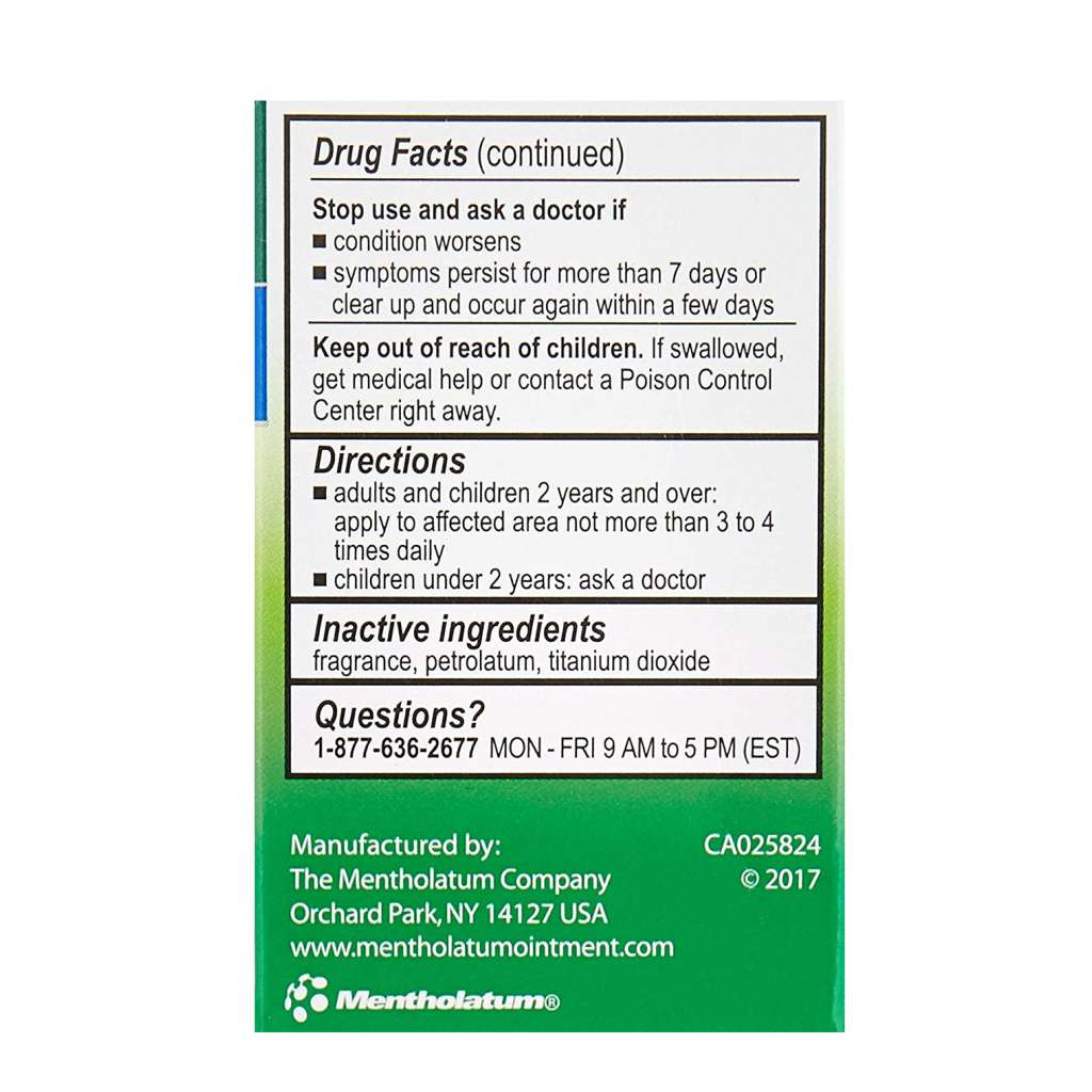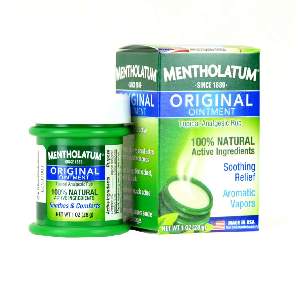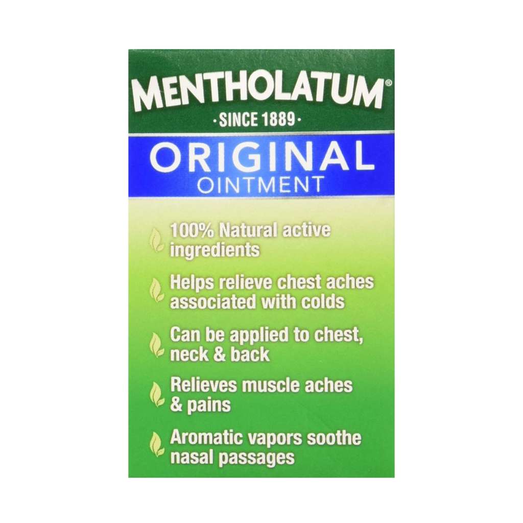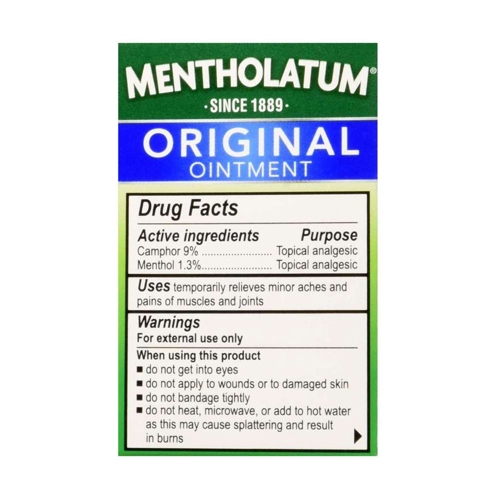 Gentle, soothing relief, trusted for generations! Topical AnalgesicMentholatumActive Ingredients:Camphor 9%; Menthol, Natural 1.3%Adults and children 2 years and over: Apply to affected area not more than 3 to 4 times daily. Children under 2 years: Ask a doctor.Inactive Ingredients:Fragrance; Petrolatum; Titanium DioxideUses:Temporarily relieves minor aches and pains of muscles and joints. Aromatic vapors.For external use only. When using this product: do not heat; do not microwave; do not add to hot water or any container where heating water. May cause splattering and result in burns; do not get into eyes; do not apply to wounds or to damaged skin; do not bandage tightly. Stop use and ask a doctor if: condition worsens; symptoms persist for more than 7 days or clear up and occur again within a few days. Keep out of reach of children. If swallowed, get medical help or contact a Poison Control Center right away. Mentholatum Original Ointment Soothing Relief, Aromatic Vapors - 1 oz