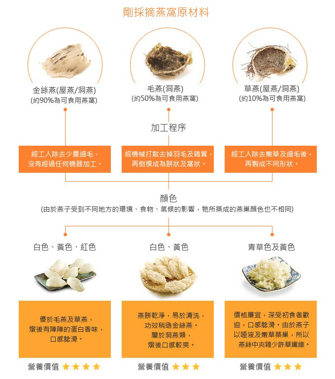 (1)屋燕:燕子将燕巢筑在人们提供的屋子里,屋顶用木材建造,室内环境依照天然山洞气温、光暗度及干湿度建筑而成,平均温度为28℃-30℃,湿度约89%-90%,潮湿阴暗。燕子早上飞离燕屋到野外觅食至黄昏时分才回到燕屋。因为栖息环境较好,燕窝中杂质及羽毛很少、较干净,形状较完整,似船形或匙羹形。金丝燕依其颜色,分为白燕(白色)、黄燕(黄色)及血燕(红色)。白燕的口感较细滑,而黄燕及血燕较爽口。