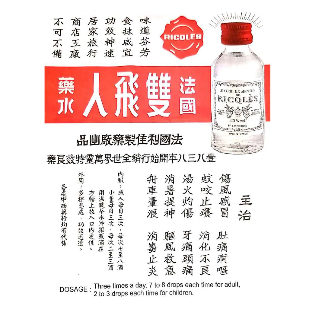 双飞人药水历史悠久,为著名老牌药,是从1838年就开始行销全世界万灵特效良药。1838年,药剂师亨利里克莱斯创建一个基于薄荷和乙醇的药水——双飞人,双飞人这个商标由此被提出,但其在1857年才真正开始。