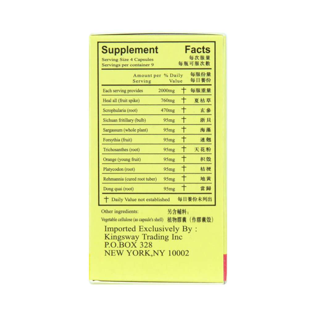 名 称:消瘰疬胶囊品 牌:中华验方产 地:中国净 重:18g(0.63oz)/36粒