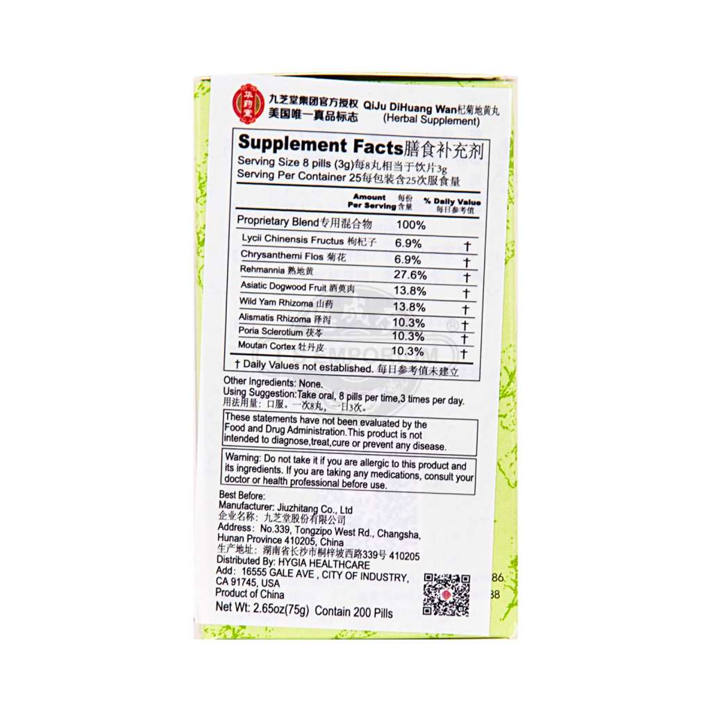 枸杞子, 菊花, 熟地黄, 酒萸肉, 牡丹皮, 山药, 茯苓, 泽泻