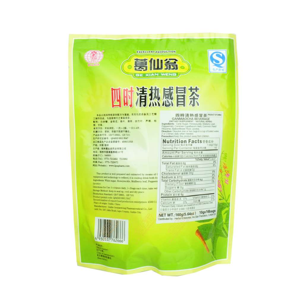 名 称:四时清热感冒茶 固体饮料品 牌:葛仙翁产 地:中国净 重:160克 (10克x16袋)注:产品上无注明保质期